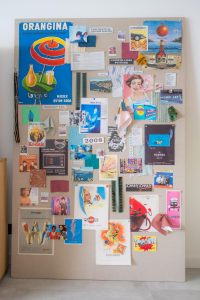 – An oversized pushpin mood board mixing vintage French ads, Riviera inspiration, and GumGum creative for a “work in progress” feel